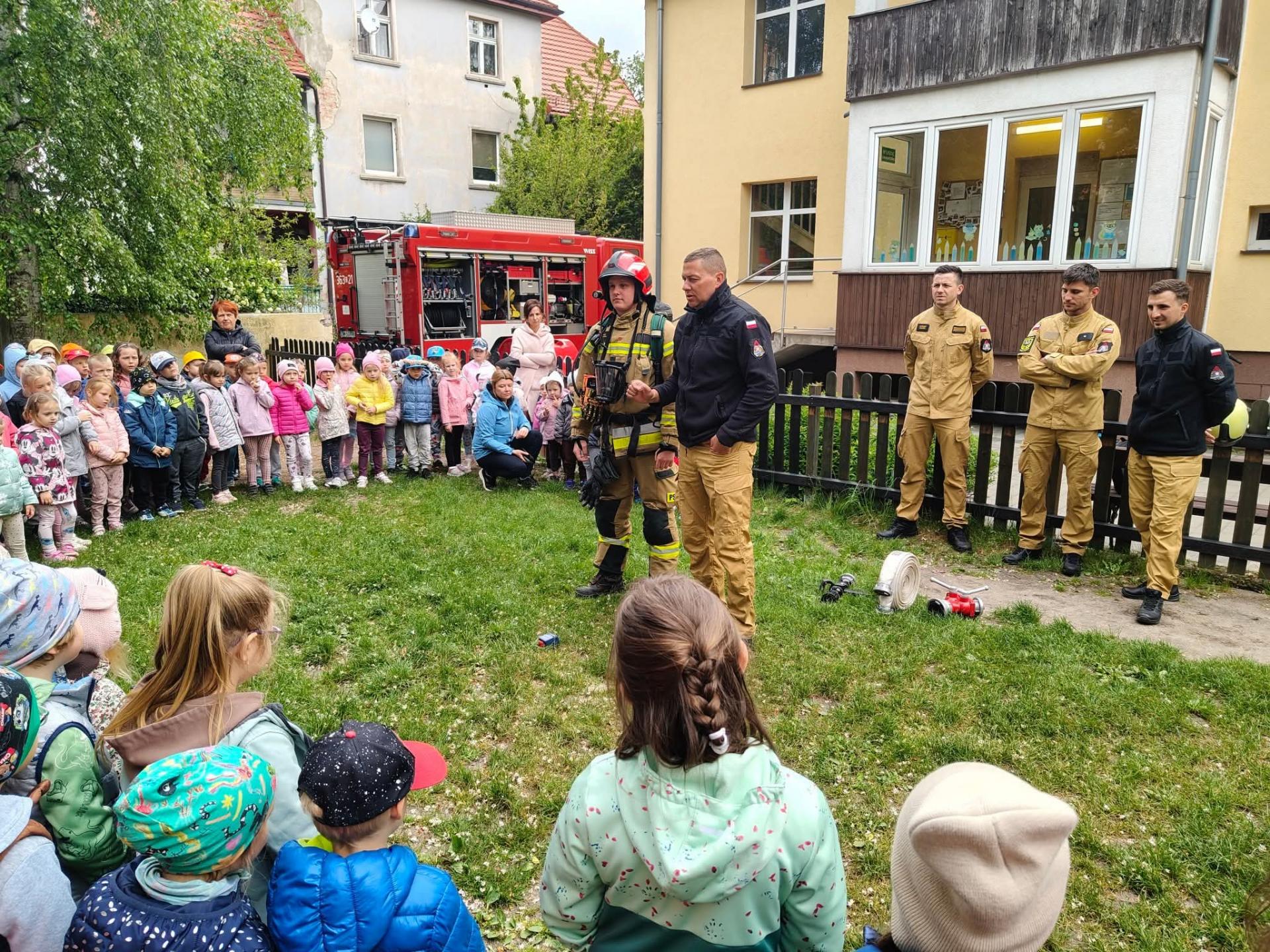 W poniedziałek 5 maja przedszkolaki gościły strażaków z Jednostki Ratowniczo-Gaśniczej nr 3 Państwowej Straży Pożarnej w Chojnowie.